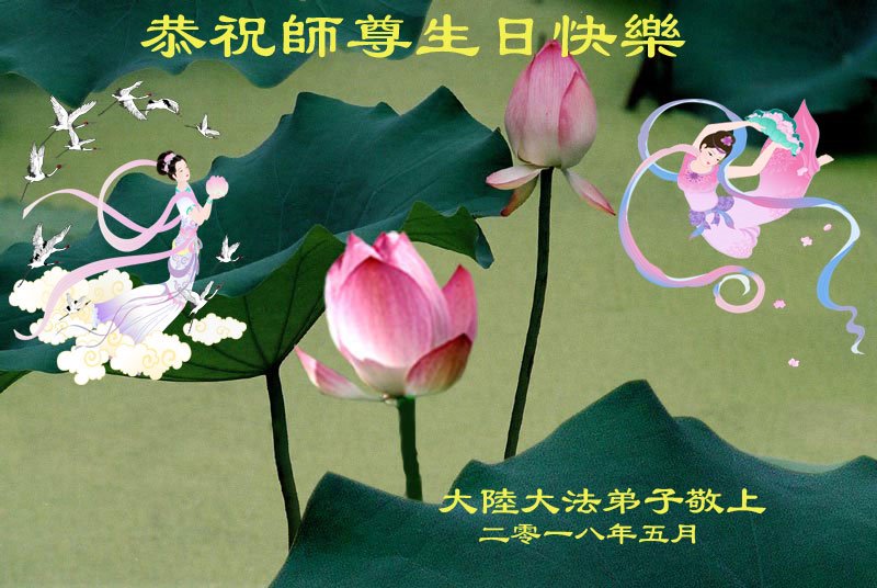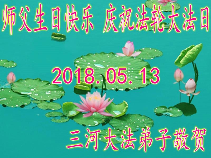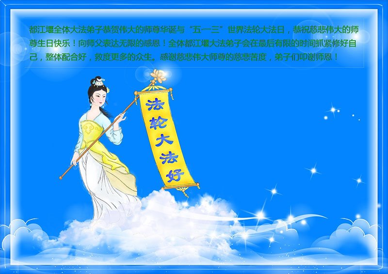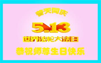 师父您好!恭祝师父生日快乐!普天同庆同贺同颂法轮大法洪传二十六周年暨第十九届世界法轮大法日!我们不负师望,紧跟师父、带着众生回家! 长春前進学法小组大法弟子拜贺! 四川省成都市都江堰市全体大法弟子恭贺师尊华诞和“五·一三”世界法轮大法日!