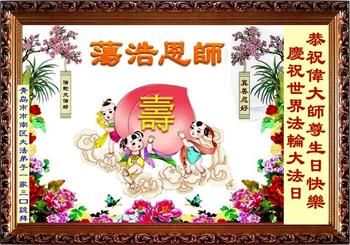山东省青岛市南东部大法弟子一家三口恭祝慈悲伟大的师尊生日快乐!热烈庆祝法轮大法洪传26周年!