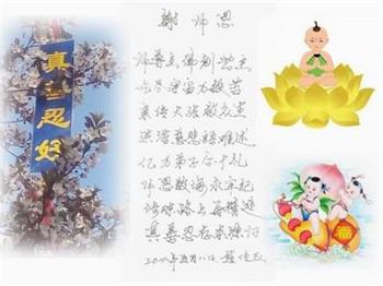 谢师恩 师尊创世为正法 吃尽宇宙万般苦 亲传大法救众生 洪浩慈悲语难述 亿万弟子合十礼 恩师教诲永牢记 修炼路上再精進 真善忍存本源归 吉林省长春一大法弟子恭祝师父生日快乐!