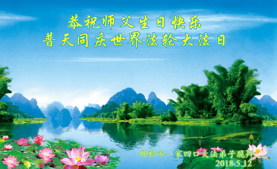 河北省邯郸市邯山区一家四口大法弟子恭祝师父生日快乐!普天同庆全世界法轮大法日!