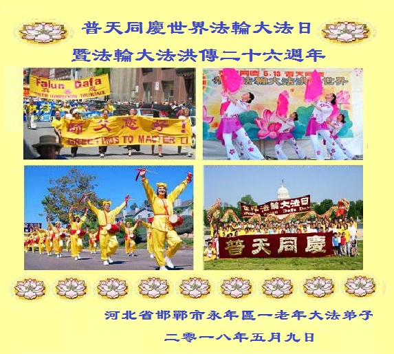 邯郸市永年区一老年弟子祝师尊生日快乐! 河北石家庄三个学法小组共祝师父生日快乐!庆祝第十九届法轮大法日!