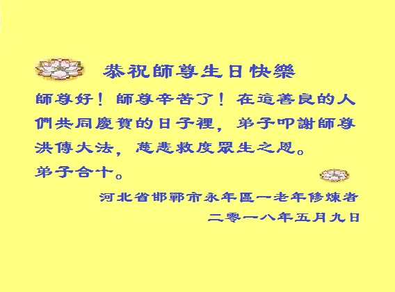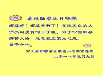 河北石家庄三个学法小组共祝师父生日快乐!庆祝第十九届法轮大法日! 河北省邯郸永年区一老年大法弟子恭祝师父生日快乐!