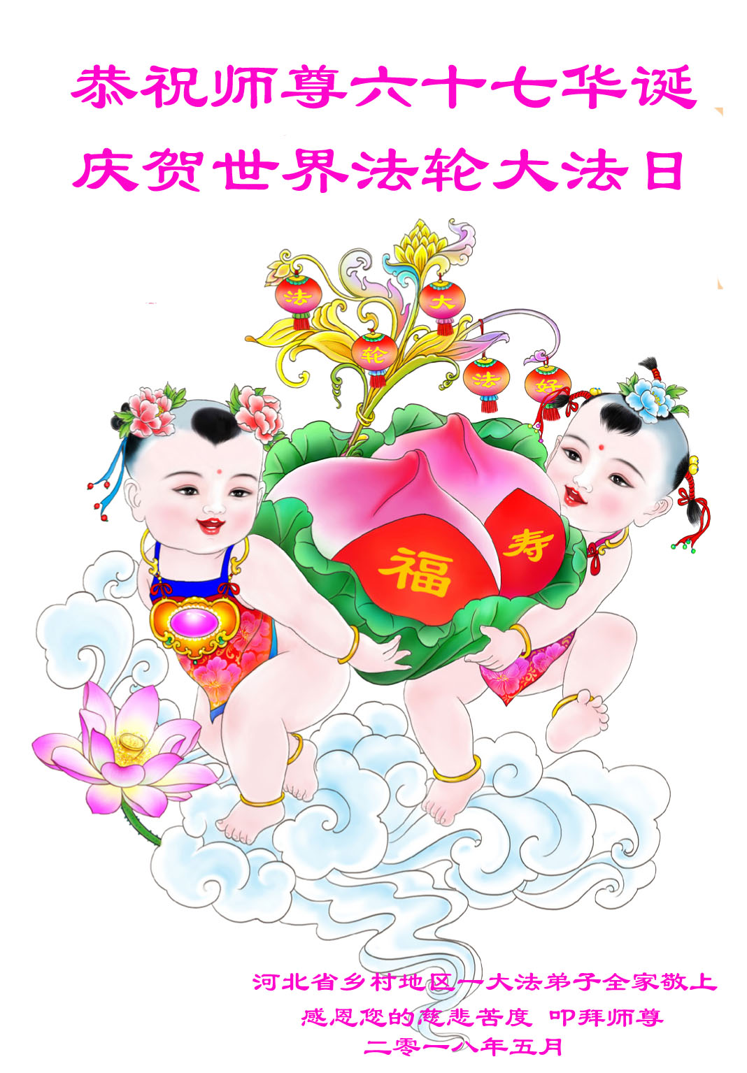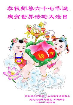 法轮大法日来临之际,我们鞍山地区大法弟子会更加努力救度众生,不辜负师父对我们的期望。 普天同庆日 弟子谢师恩 恭祝师父华诞日,普天同庆齐欢聚。 大法洪威照十方,弟子同心正念足。 不忘师尊再造恩,永去人心返家院。 大法洪传二十载,佛光普照万古流。 弟子谨记师尊言,心怀大法真善忍。 鞍山大法弟子拜谢师尊 二零一八年五月十二日 河北石家庄农村大法弟子全家恭贺法轮大法日!