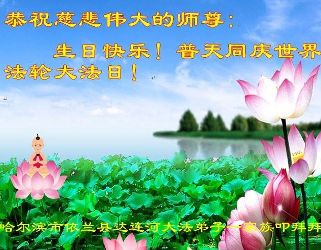 黑龙江省哈尔滨市依兰县达连河大法弟子一家族恭祝师父生日快乐!