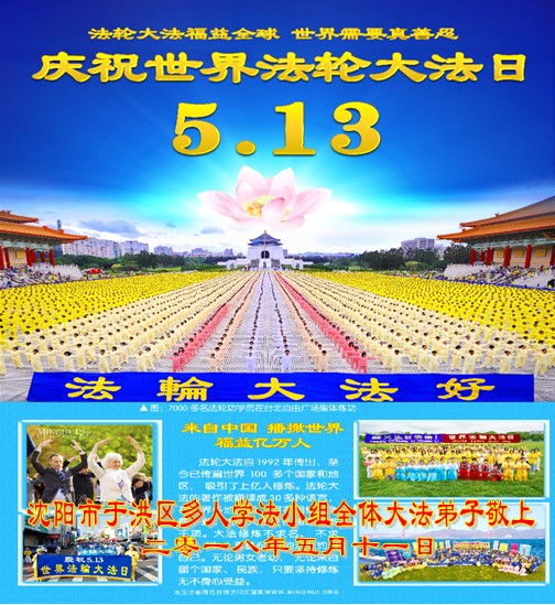 恭祝慈悲伟大的师尊生日快乐! 弟子要做好三件事,更加精進,请师父放心! 辽宁省沈阳市于洪区学法小组庆祝世界法轮大法日!