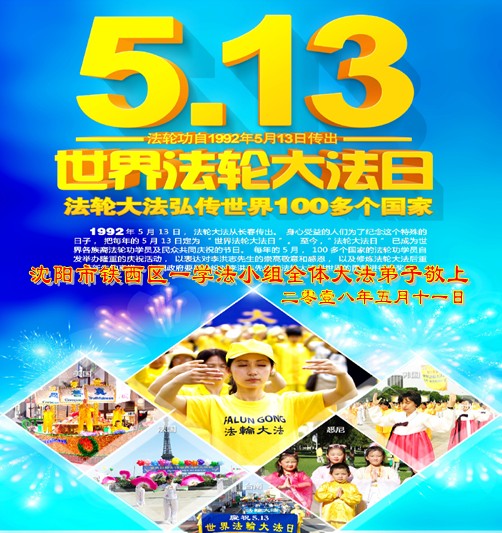 恭贺世界法轮大法日!恭祝慈悲伟大的师尊生日快乐! 我们要用这一天多救人的方式来祝贺这伟大的节日! 唐山市一学法小组 辽宁省沈阳市铁西区大法弟子恭祝师尊生日快乐!