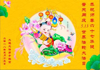 师尊,您好! 我是一位新学员,是一位高校教师,由于受到中共的长期政治(药物)迫害,我患上了肾脏病和周围神经损伤。在一位朋友的介绍下,2017月年9月开始阅读《转法轮》,这本书使我明白了修炼中的许多关键问题,这一系列深邃的哲理,给我们整个人类指明一个返本归真的方向和自我救赎的方法和技能。 通过修炼法轮功,我的肾病有了一定的好转,主要指标基本恢复了正常,这是用现代医学包括中医手段都很难达到的令人惊奇和振奋的效果。 因而我给自己立下一个目标:我要不离不弃跟随师父精進修炼、弘扬佛法、普度众生,让更多人通过修炼得到身心健康,提高人类道德 在此戊戌年5.13世界法轮大法日!来临之际,恭祝师父生日快乐!愿法轮大法的佛光永照人间! 山东济南法轮大法新弟子恭祝师尊华诞。 二零一八年五月十二日夜 四川省内江市大法弟子恭贺世界法轮大法日!暨师尊华诞!