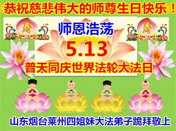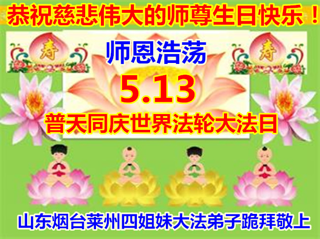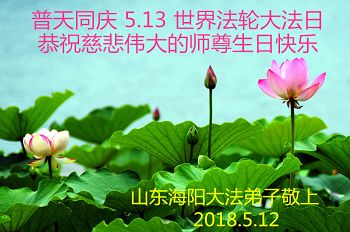 恭祝师尊生日快乐、普天同庆五一三世界法轮大法日,我们全体大法弟子表决心紧跟师父的正法進程,做好三件事,完成大法弟子的历史使命。 二零一八年五月12日 山东烟台莱州四姐妹大法弟子恭贺世界法轮大法日暨师尊华诞!