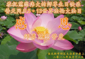感恩慈悲救度的师尊!我知道自己还有好多的执着心,我要修好自己,勇猛精進,多学法,跟上大法的進程,做好三件事,跟师尊回家。 河北省石家庄市一大法弟子及家人叩拜师尊 黑龙江省佳木斯市郊区大法弟子恭祝慈悲伟大的师尊生日快乐!