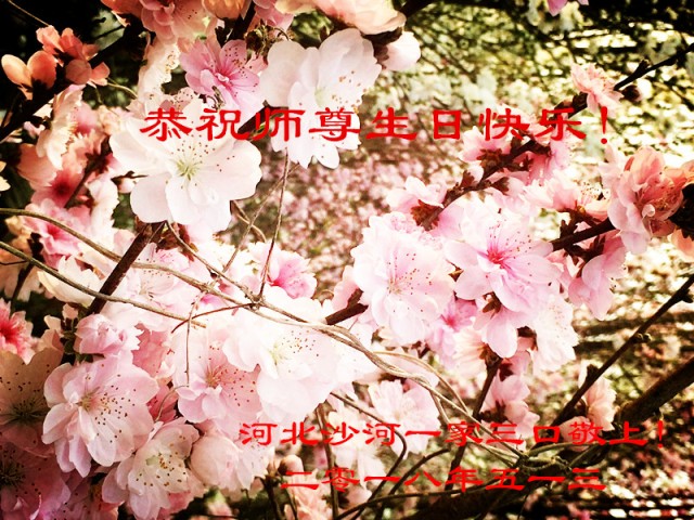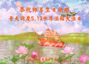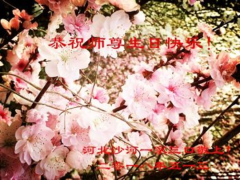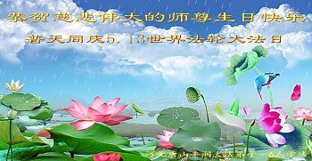 尊敬的师尊:在您的慈悲保护下,我们两人在一个单位相遇,一起学法,一起做三件事,共同创造了一个小的正法环境,今后我们会更加珍惜我们的环境,做好三件事,跟您回家! 北京房山区一学法小组恭祝师尊生日快乐!普天同庆法轮大法日!