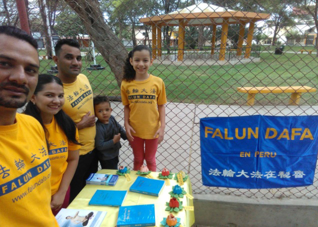 【明慧网二零一八年五月十九日】二零一八年五月十三日是第十九届“世界法轮大法日”,也是法轮功创始人李洪志师父六十七岁华诞。部份秘鲁法轮功学员在首都利马圣伊德洛区(SAN ISIDRO)的阿方索乌加特公园(PARQUE ALFONSO UGARTE)举办活动,庆祝法轮大法弘传世界二十六周年,同时表达对师尊的感激之心。 图1:五月十三日,秘鲁法轮功学员在公园庆祝“世界法轮大法日”,表达对李洪志师父的感激。 |