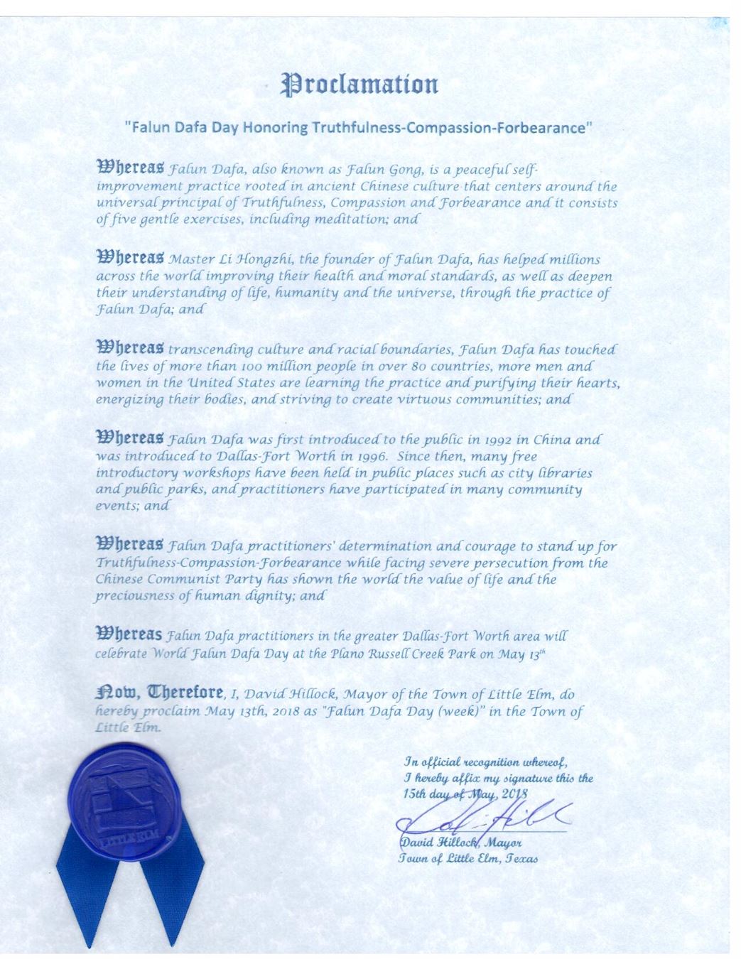 译文如下: 褒奖令 “法轮大法日表彰真、善、忍”鉴于,法轮大法,又称法轮功,源于古老中国文化,是以宇宙特性“真、善、忍”为原则的一个平和、自我提高的功法,它由五套舒缓的功法组成,包括打坐; 鉴于,李洪志大师,法轮大法创始人,已经帮助全世界上亿的人改善了身体的健康,提高了道德,同时,通过修炼法轮大法,使他们加深了对生命、人生、以及宇宙的认识; 鉴于,法轮大法超越文化和种族的界限,在全世界八十多个国家吸引了上亿人在八十多个国家修炼。在美国,越来越多的男人、女人正在通过学习法轮大法来净化他们的心灵,变得精力充沛,并使社区道德回升; 鉴于,法轮大法从一九九二年在中国传出,一九九六年法轮大法弘传到达拉斯-沃思堡地区。从那时起,在的许多图书馆、公园举办了许多期免费法轮大法教功班。法轮大法修炼者参加了许多社区活动; 鉴于,面对中共的残酷迫害,法轮大法学员展现出的对“真、善、忍”的坚定,向全世界展示了生命的价值和人格的尊严; 鉴于,达拉斯-沃思堡地区法轮大法学员五月十三日在布兰诺市罗素溪(Russell Creek)公园庆祝世界法轮大法日; 鉴此,我,大卫·希尓勒(David Hillock),小榆树市市长,宣布二零一八年五月十三日为小榆树市“法轮大法日”