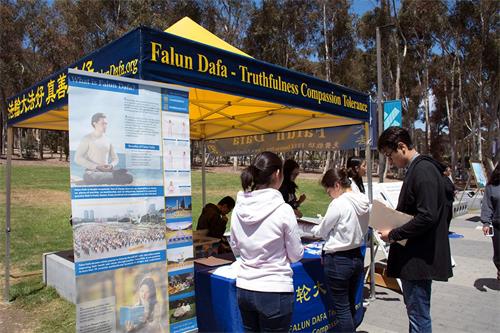 几年前,随着来圣地亚哥旅游的大陆游客越来越多,圣地亚哥法轮功学员开始到中途岛航空母舰博物馆旅游景点讲真相。常年到中途岛景点的法轮功学员阿梅说,“来到这里,就是为了中国人,因为他们在国内看不到真相。” 阿梅说:“来自中国的游客很多。很多人不了解法轮功被迫害的真相,对四二五也不了解,因为中共为了迫害法轮功,把和平上访说成是‘围攻中南海’。一个导游就说,你们为什么要围攻中南海?这就是搞政治。等他听了一位经历过四二五的法轮功学员和他讲上访过程后,他就明白了。” 一位来自成都的Eva朱女士说:“在中国看不到这些,来旅游,也了解了法轮功真相,并不像中国宣传的那样,其实法轮功挺好的。” UCSD大学校园举行“真善忍美展” 四月二十四日,加州大学圣地亚哥分校(UCSD)法轮大法俱乐部在该校高人流量的校区举办了《真善忍美展》。  图4:明白真相的民众签名支持法轮功反迫害 |