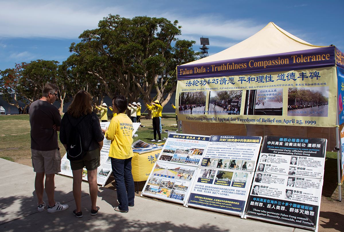 | 【明慧网二零一八年五月三日】二零一八年四月底,和世界各地的法轮功学员一样,美国圣地亚哥法轮功学员举办了“真善忍美展”和景点集体炼功弘法活动,纪念“四二五和平上访”十九周年,并向当地民众和中国游客讲真相。 因“四二五”走入修炼的西方学员 一九九九年四月二十五日,上万名法轮功学员到北京中南海附近的国家信访局上访,要求释放在天津被警察暴力抓捕的四十五名法轮功学员。时任中共总理朱镕基接见了法轮功代表,并答应释放天津被抓的法轮功学员,让法轮功修炼者有合法修炼的权利。得到这些承诺后,上万人立刻安静散去,地上没有留下一点纸屑。 虽然四二五和平上访的结局看似圆满,然而不到三个月,同年七月二十日,时任中共总书记的江泽民一意孤行发起了对法轮功的非法镇压。 圣地亚哥西人法轮功学员Mark Matthew说,他当时看了电视新闻后,从法轮功学员肃穆平静的表情就感到他们很不一般,同时本着他对中共的了解,他想,被中共镇压的,很可能其实是好的。他于是开始去了解法轮功,最后也走入了修炼。 中途岛景点集体炼功 四月二十一日,结合纪念“四二五和平上访”十九周年之际,圣地亚哥法轮功学员在中途岛景点增加了集体炼功活动。祥和场面吸引游客驻足观看并拍照,其中不少是来自中国大陆的游客。  图1:圣地亚哥法轮功学员在中途岛景点增加了集体炼功活动 |