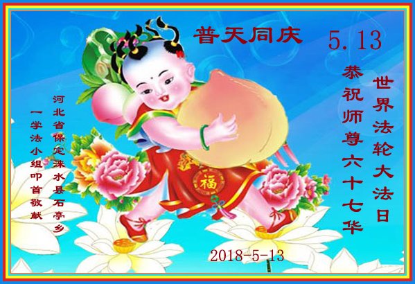 河北省保定市涞水镇石亭乡一学法小组大法弟子恭祝第十九届“五·一三”世界法轮大法日!祝慈悲伟大的师尊生日快乐! 河北省保定市涞水镇石亭乡一学法小组大法弟子叩拜敬上 二零一八年五月 河北省保定市涞水县一大法弟子恭祝慈悲伟大的师尊六十七华诞!普天同庆“5.13”世界法轮大法日!
