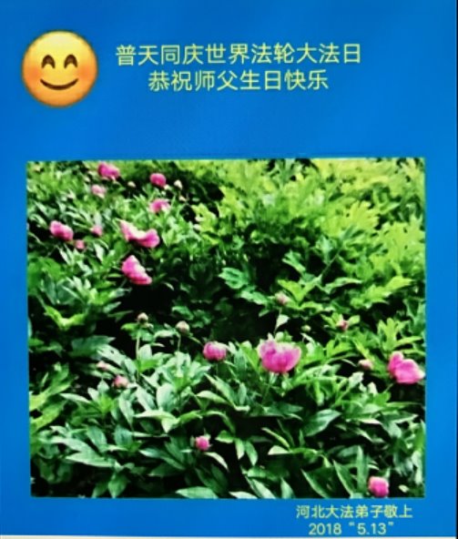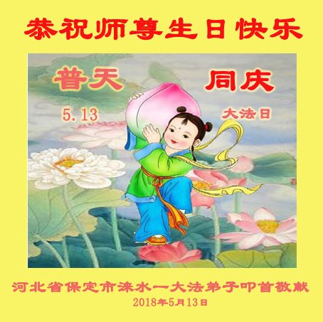 师父您好! 师父您辛苦了! 总感觉时间太慢,中国大陆的大法弟子想念师父;总感觉时间太快,世界上还有很多世人没有觉醒。在二零一八年五月十三日这个殊胜而伟大的日子即将来临之时,弟子合十捧真心跪拜师父:“恭祝师父生日快乐!”并感恩师父的慈悲苦度!弟子只有学好法,真修实修,唯有精進,以报师恩。 河北保定一中年大法弟子恭祝师父生日快乐! 二零一八年五月三日 河北保定大法弟子恭祝师父生日快乐!恭贺5.13世界法轮大法日!