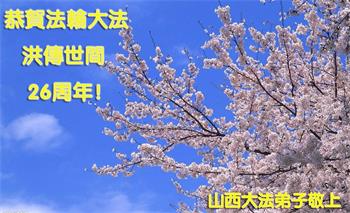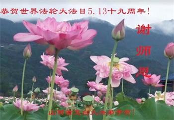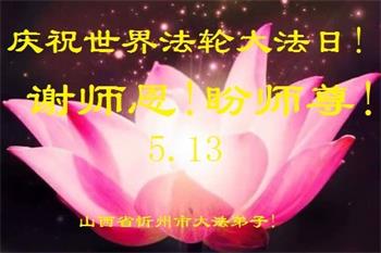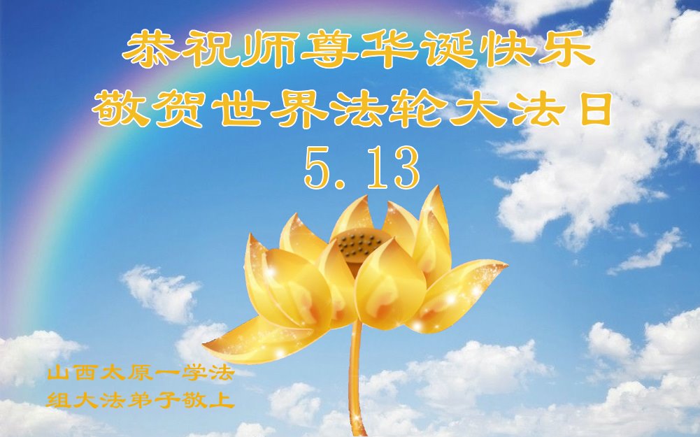 我们感恩“5.13”这个既平凡又伟大的日子给人类带来的光明与希望!我们感恩“5.13”!感恩法轮大法!感恩慈悲伟大的师尊为救度众生,为挽救穹宇坏、灭带领我们走过风风雨雨的26年!师尊您巨大的承受与艰辛的付出,我们无以回报!我们无限感恩!师尊您辛苦啦!正法还没有结束,救度众生是我们的责任、使命!我们还要在救度众生中修好自己!叩拜师尊!感恩师尊! 山西太原大法弟子恭贺世界法轮大法日暨师尊华诞!