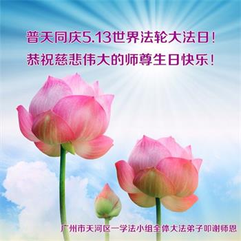 普天同庆五•一三世界法轮大法日! 广东广州大法弟子母女恭祝师尊生日快乐!感谢师尊慈悲救度! 广东广州一学法小组大法弟子恭贺法轮大法日!
