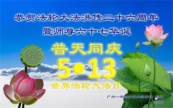 广东广州大法弟子普天同庆世界法轮大法日!恭贺法轮大法洪传二十六周年!恭祝师尊生日快乐!