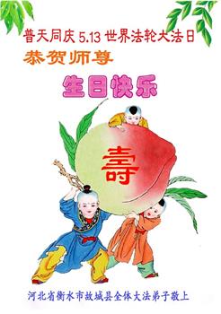 【明慧网二零一八年五月八日】 河北省衡水市故城县全体大法弟子恭贺世界法轮大法日