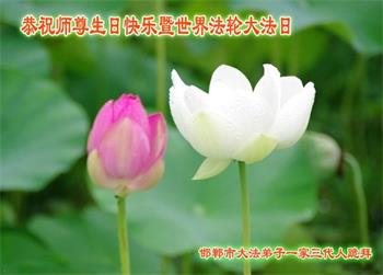 河北省邯郸大法弟子一家三代人恭祝师尊生日快乐!暨世界法轮大法日!