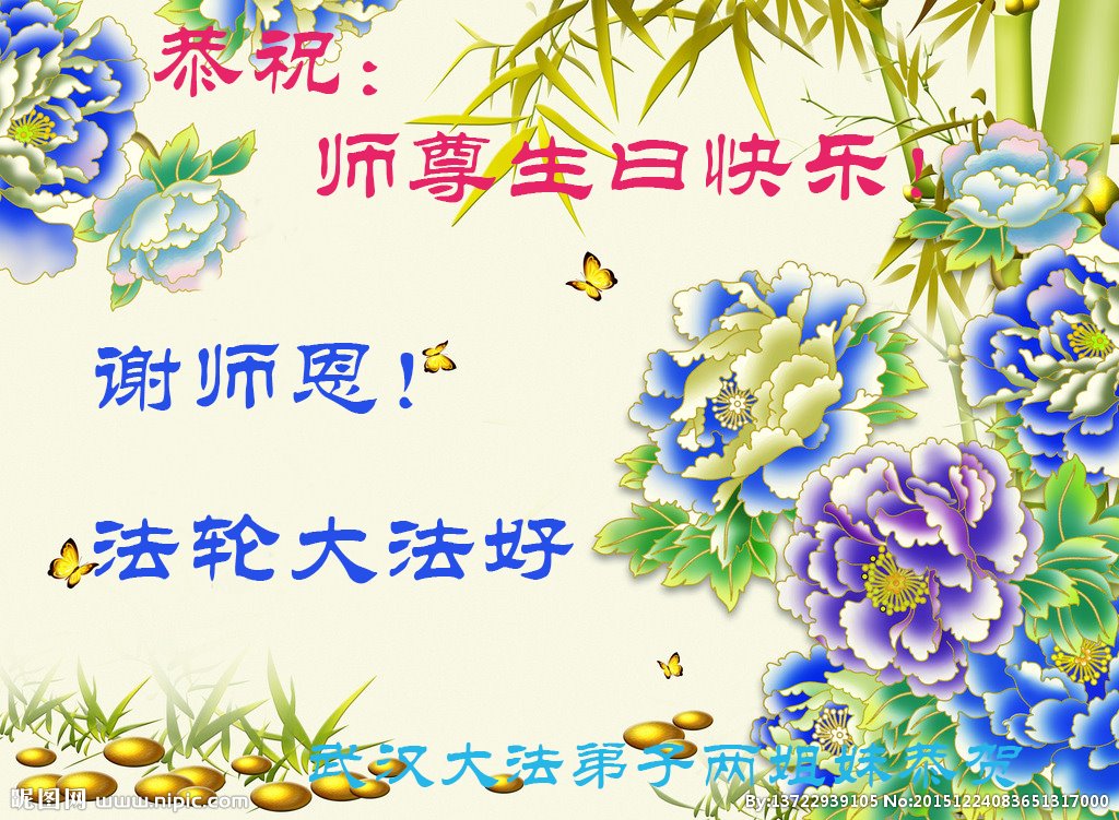 恭祝慈悲伟大师尊生日快乐!恭祝世界法轮大法日! 师父;今天是您生日,弟子给师尊拜寿!叩首!叩首!再叩首! 修大法真好。有师父真幸福!在修烁中,当执着心过不去时,当遇到磨魔时,当徘徊在一个层次上不去时就会得到师尊尊点悟,保护,棒哈!当在法上悟道提高一点时,师尊又给弟子展现法的美好鼓励弟子。 有师父真幸福,修真,善忍。真好!在真、善、忍的净化下,远离了烦恼、悲伤。在师尊保护下平稳做三件事。 湖北红安大法弟子 二零一八年四月三十日 湖北省武汉大法弟子两姐妹恭贺法轮大法日!