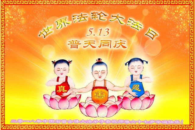 祝贺5.13法轮大法日开传26周年! 谢谢师父把佛法,法轮大法在世间传开,真善忍的美好,给众生带来了光明,佛光普照,广度众生。宇宙在成住坏灭的规律中,人类已经走到了尾声,在危难的时刻,法轮大法是众生得救的唯一希望,师父为众生承担了历史上的一切,担当了众生的罪业。开天辟地,开创了万事万物,才有今天众生的一切,法轮常转!法正乾坤!在万物更新的时刻,佛恩浩荡,把伟大的佛法撒播人间。四十多种文字,不论肤色,不论富贵,只看人心,大法的洪恩福泽九州。三千年的优昙婆罗花同时在世间开放。宇宙的众生,想得救的生命都在期盼。大法的威德在苍宇间,永远传颂,普天同庆。 法轮大法是正法。大法启迪了众生的本性,提高了人类的道德品质,在正邪的较量中,师父法力无限。修炼人的每一步都离不开师父的呵护。对世人的慈悲,不停的呼唤,叫弟子讲好真相,多救众生,不要被谎言欺骗,明辨是非,叫众生快快醒,快醒,得了大法才知道大法是多么的伟大、多么玄妙、多么美好,使自己内心平和,改变自己的心态,既严肃又光明。做好了,师父会给你最好的东西。感谢师父洪大的慈悲,指引大法弟子走向返本归真之路。这是生命永久的期盼,谢谢师父!我们大法弟子受益太多,身体得到了健康,无病一身轻,用人类的语言无法表达,在大法修炼中,我的生命已经得到了十几年的延续,在许多磨难和闯关中,谢谢师父的指点,同时又替弟子承受,为弟子操心,在最后的时刻,我们一定要珍惜时间,听师父的话,做好三件事,多救众生。 大陆武汉市大法弟子:合十 2018.5.1 湖北省荆州市松滋市一大法弟子及其家属恭祝师尊生日快乐!祝贺世界法轮大法日!