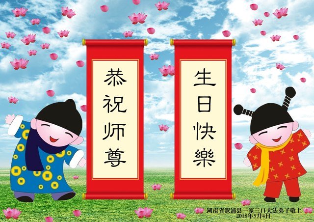 恭祝慈悲伟大师尊生日快乐!庆祝法轮大法洪传世界二十六周年 湖南湘潭大法弟子谢师恩 合十 湖南省怀化市溆浦县一家三口大法弟子恭祝师尊生日快乐!