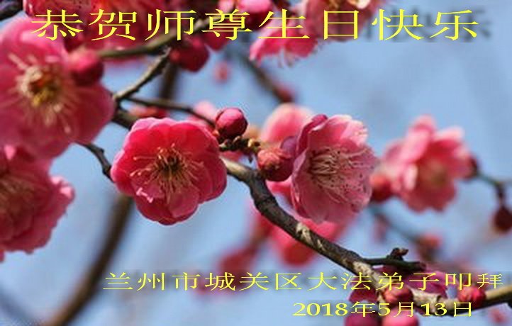 【明慧网二零一八年五月八日】 甘肃省兰州市城关区大法弟子恭祝师尊生日快乐!恭贺世界法轮大法日!谢师恩!