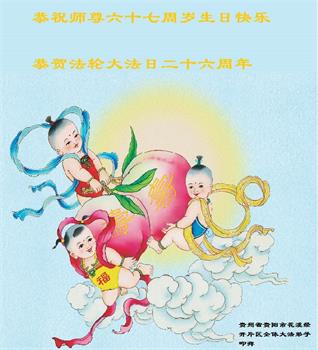 在世界法轮大法日到来之际,我们贵州省全体大法弟子向慈悲伟大的师尊致以崇高的敬意和最诚挚的问候:恭祝师尊生日快乐!师尊您辛苦了!我们将一如既往遵循师尊的教导,做好三件事,坚修大法心不动,紧跟师父安排的正法進程,兑现我们的史前誓约,圆满随师还。 |