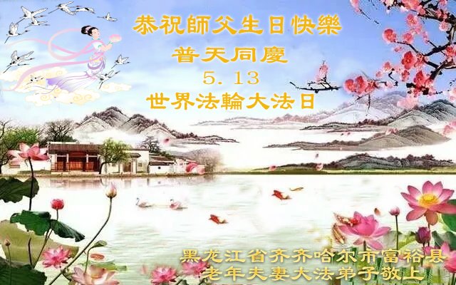 同庆“五一三”世界法轮大法日! 黑龙江省齐齐哈尔市富裕县夫妻大法弟子庆祝大法洪传26周年!世界法轮大法日!