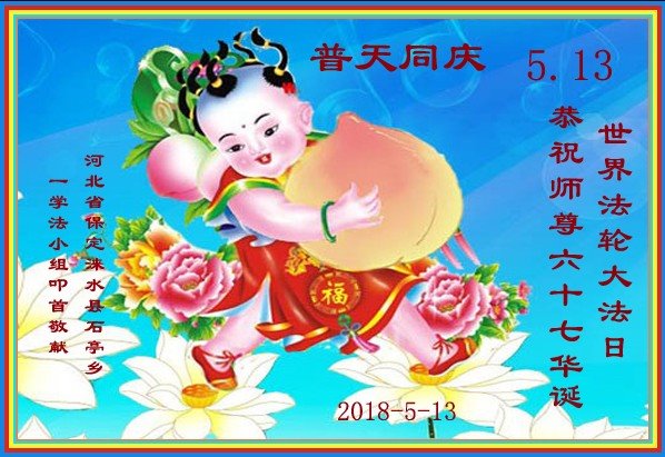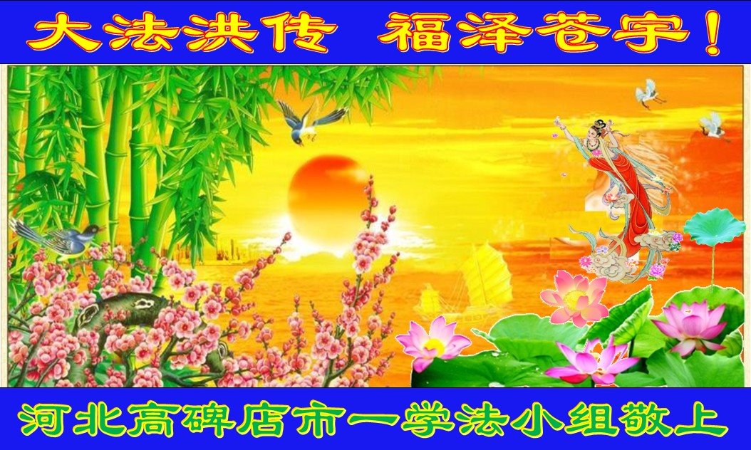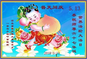 幸遇大法洪传时 得法修心紧随师 抓紧做好三件事 持之以恒归正路 它日真相大显时 大法威德耀寰宇 河北省保定市涞水镇石亭乡一学法小组大法弟子普天同庆同祝第十九届“五·一三”世界法轮大法日!恭祝慈悲伟大的师尊生日快乐!