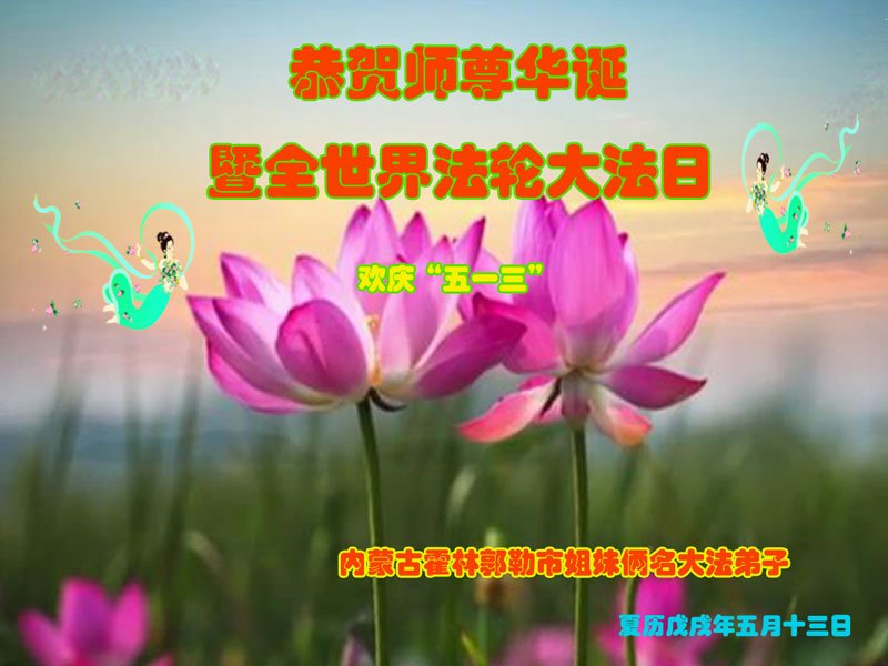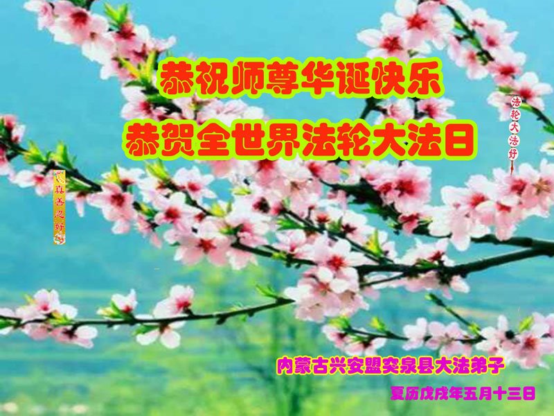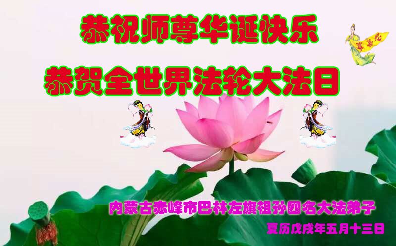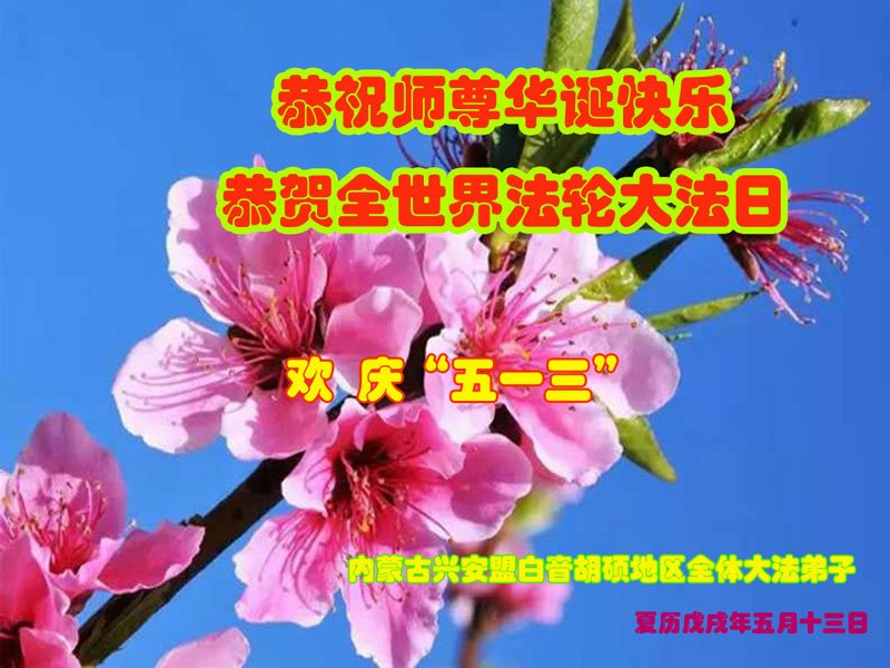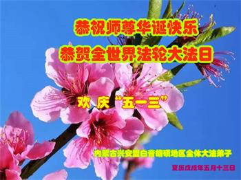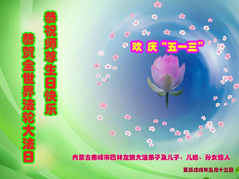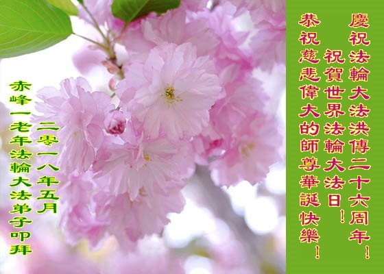 【明慧网二零一八年五月八日】 内蒙古自治区赤峰一老年法轮大法弟子恭祝师尊生日快乐!祝贺世界法轮大法日!庆祝法轮大法洪传二十六周年!