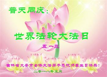 【明慧网二零一八年五月八日】 吉林省白城市大安市全体大法弟子祝贺师尊生日快乐!恭贺法轮大法日!