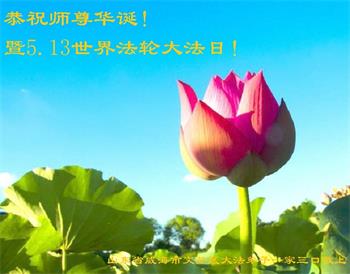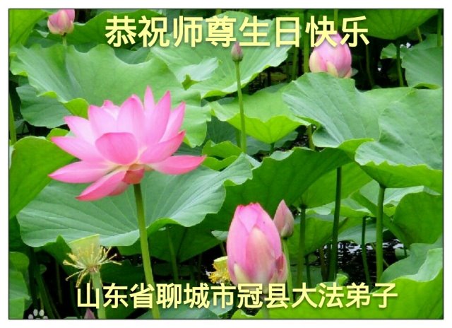 大法洪传正苍穹 精進实修莲果成 助师正法救众生 缘结正果更殊胜 山东省聊城市冠县大法弟子学法小组跪拜敬上 二零一八年五月五日 山东邹平大法弟子恭祝师尊生日快乐!