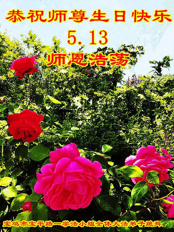 尊敬的师尊:您好!弟子唯有做好三件事,多学法,多救人,走好师父安排的路,精進、精進、再精進,跟随师父回家。叩拜师尊!合十 陕西省宝鸡姜谭路一学法小组全体大法弟子恭祝慈悲伟大的师父生日快乐!普天同庆世界法轮大法日!