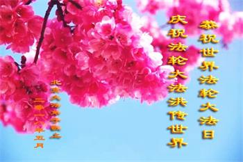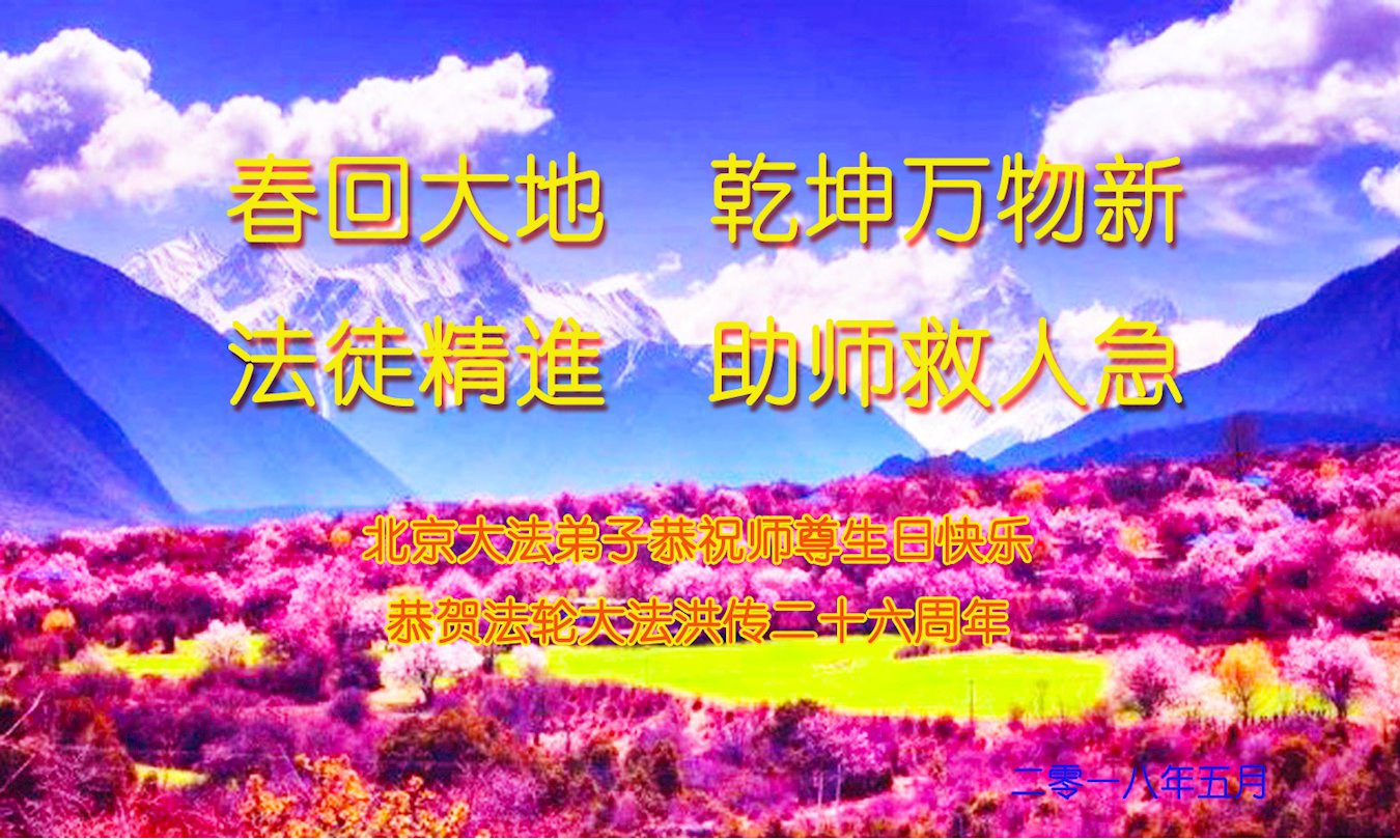 北京大法弟子恭贺法轮大法洪传二十六周年 春回大地 乾坤万物新 法徒精進 助师救人急 北京四十名大法弟子恭祝师尊生日快乐!恭贺大法洪传二十六周年!