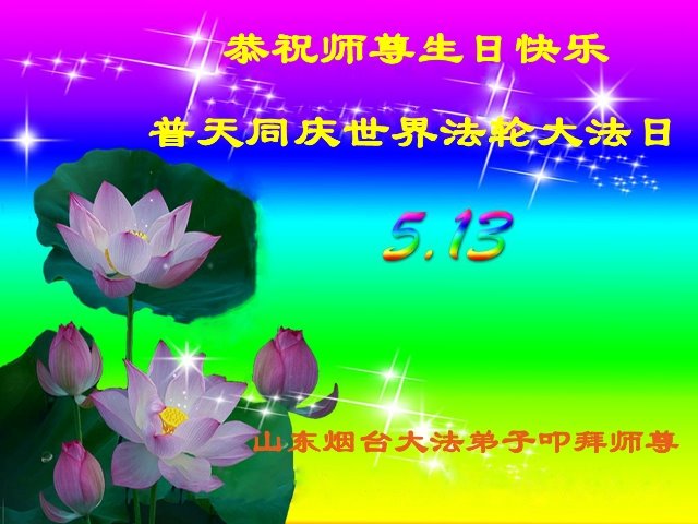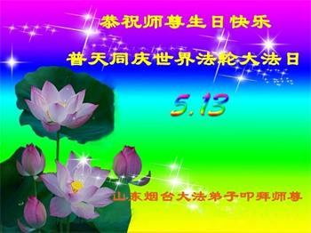 山东烟台大法弟子恭祝师尊生日快乐!普天同庆世界法轮大法日!