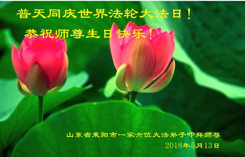 弟子叩谢师恩!师尊您辛苦了!弟子唯有精進实修,以报师恩。 山东省烟台市莱阳市一家六位大法弟子叩拜师尊,恭祝慈悲伟大的师尊生日快乐!恭贺世界法轮大法日!