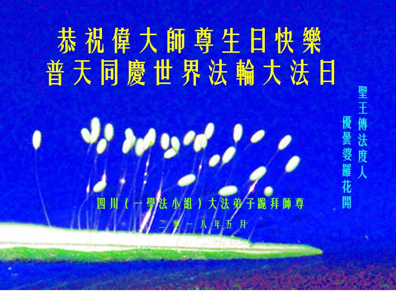 阴霾邪灵将尽,世人觉醒,万象更新新宇来临之际。我们大法弟子以崇敬的心情,恭迎来了普天同祝、同庆、同颂的世界法轮大法日!同时以崇敬的心情恭迎来了普天同祝、同庆、同颂、同贺的慈悲而伟大的师尊华诞!在此,我们凉山全体大法弟子,恭祝慈悲而伟大的师尊生日快乐!感谢师尊的慈悲苦度,感谢师尊为我们的操劳和辛勤的付出!我们不会忘记,作为大法弟子的神圣使命和誓约,在最后的时刻里,我们一定更加努力精進实修,努力学好法,广讲真相,多救更多的众生,来报答师恩!在此向慈悲而伟大的师尊叩首!叩拜!恭祝师尊生日快乐!恭贺神圣而伟大的,普天同庆的世界法轮大法日! 四川泸州大法弟子恭祝师尊生日快乐!