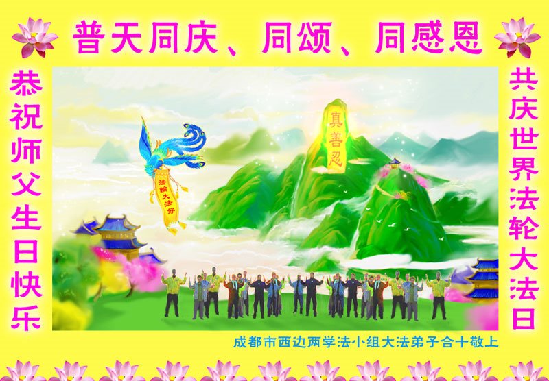 四川省成都西边两学法小组大法弟子恭贺法轮大法日!恭祝师父生日快乐!