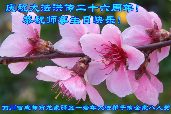 弟子努力的修好自己,做好三件事,跟上正法進程。 四川省成都市龙泉驿区一老年大法弟子携全家八人庆祝大法洪传二十六周年!恭祝师尊生日快乐!