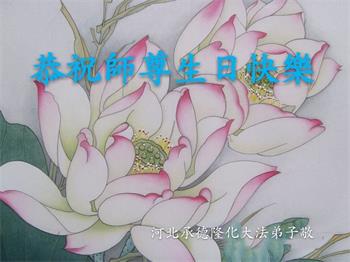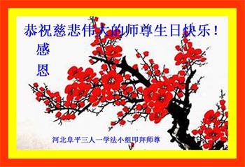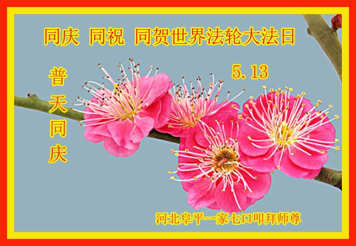 河北阜平大法弟子一学法小组恭祝师尊生日快乐!同庆同贺同祝世界法轮大法日。在这大法洪传二十六年的时刻。感恩师尊的慈悲苦度,牢记师尊教导向内找的法宝。做好三件事,修好自己救度众生。 河北承德市隆化县一大法弟子恭贺世界法轮大法日!