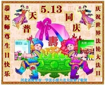河北省衡水市一学法小组六名大法弟子恭祝慈悲伟大的师尊生日快乐!恭贺第十九届全世界法轮大法日!庆贺法轮大法洪传全世界二十六周年!