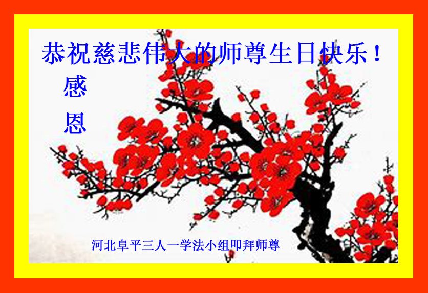 恭祝师尊戊戌年生日快乐! 恭贺2018年世界法轮大法日! 感谢师尊为弟子、为众生的辛苦付出,弟子唯有修好自己,救好众生,完成使命,不让师尊与众生失望。 燕郊一中年大法弟子敬上 河北阜平母女俩及孙女恭祝慈悲伟大的师尊生日快乐!