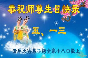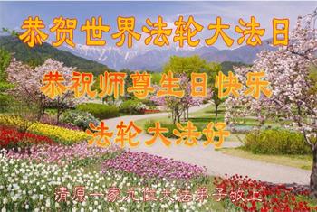 辽宁省抚顺市清原县一大法弟子携全家人恭贺世界大法日暨师尊华诞!