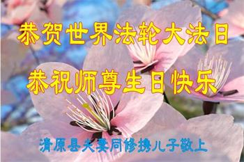 辽宁省抚顺市清原县夫妻同修携儿子恭贺世界大法日暨师尊华诞!