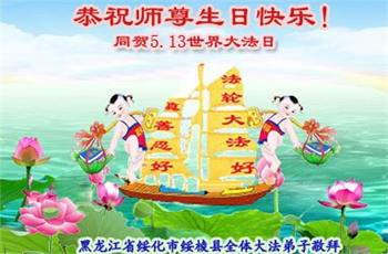 黑龙江省绥化市海伦市全体大法弟子恭祝师尊生日快乐!同贺世界法轮大法日!
