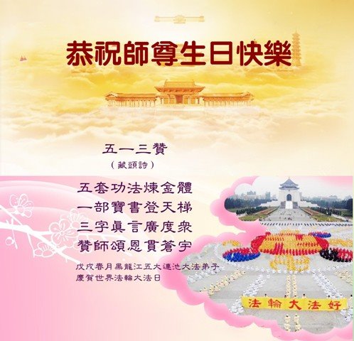 五一三赞 (藏头诗) 五套功法炼金体, 一部宝书登天梯, 三字真言广度众, 赞师颂恩贯苍宇。 黑龙江省黑河市北安市两位大法弟子恭祝师尊生日快乐!庆祝世界法轮大法日!