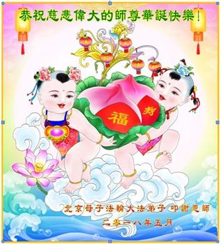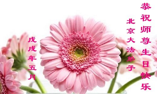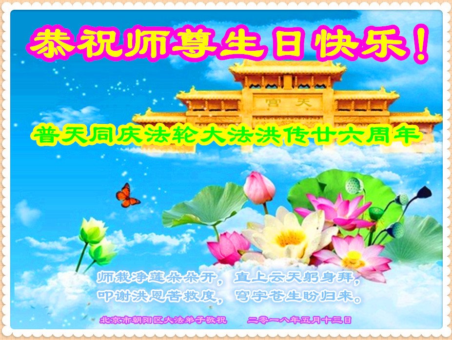 师尊生日快乐!谢谢师尊慈悲苦度! 请师尊放心,我们全体大法弟子一定不辜负师尊的殷切期望,做好三件事,圆满随师还。 二零一八年四月八日 北京大法弟子恭贺世界法轮大法日!